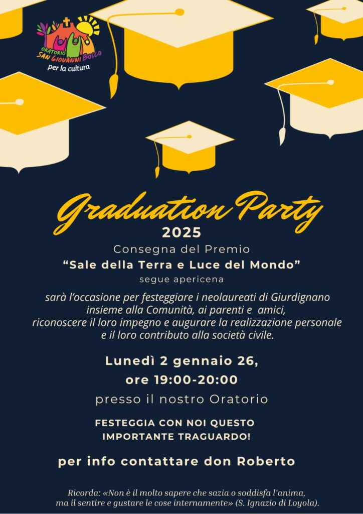 Graduation Party è l’occasione di fine anno per festeggiare insieme a tutta la comunità i neo laureati insieme ai loro famigliari e amici. Non è solo l’occasione di fare festa ma anche per riconoscere il loro impegno e augurare ai nostri giovani un impegno nella società civile e un ritorno per il nostro territorio.